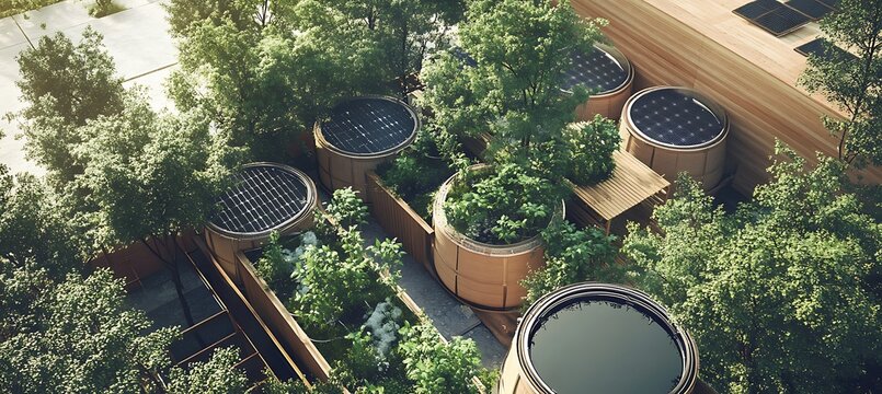 Aerial view of sustainable urban farm with solar panels and lush greenery for eco friendly living style