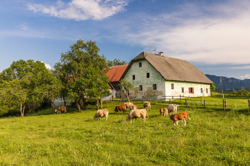 Austria, Carinthia, old farm house and cows on pasture