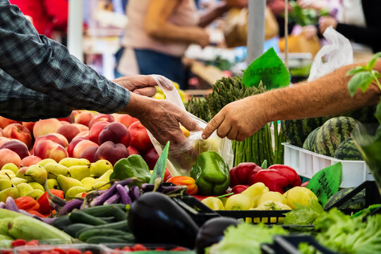 woman buying fruits, Hands exchanging produce at busy farmers' market, fresh vegetables displayed