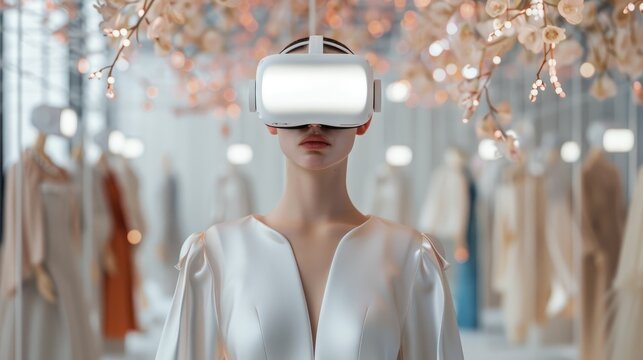 A fashion designer explores innovative designs using AI technology, showcasing mannequin dressed in stylish white outfit and wearing virtual reality headset. setting is modern and creative, reflecting