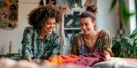 A designer collaborates with a model in a creative studio, surrounded by fashion sketches and vibrant dress materials.