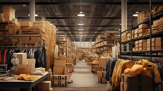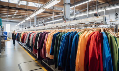 Interior of garment factory. Tailoring industry, fashion designer workshop, industry concept