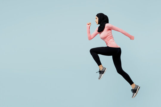 Full body side view young asian muslim fitness trainer sporty woman wear pink abaya hijab spend time in gym run fast jump high isolated on plain blue background studio. Workout sport fit abs concept.