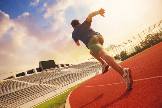Athlete runner running on athletic track training her cardio. Jogger woman jogging at fast pace for competition race on blue lane at summer outdoor stadium wearing red capri tights and sports shoes.