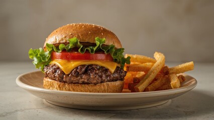Delicious cheeseburger with fries and tantalizing toppings