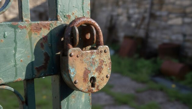 Rustic Old Padlock Securing a Weathered Green Metal Gate Outdoors