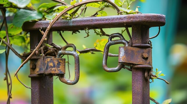 Severed rusty metal security clasps on an old outdoor gate entwined with green vines