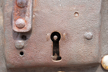 Old grunge wooden door and fence detail with vintage metal handle and lock