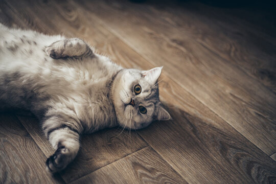british grey tabby cat laying on the wooden floor top view flatlay.