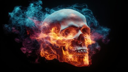 A dramatic flaming skull, surrounded by vibrant ethereal smoke, symbolizes death, mystery and the fleeting nature of life, captivating viewers with its haunting beauty and intensity.