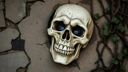 "A photo image of a skeletal skull with sunken eyes and a twisted, macabre grin, surrounded by crumbling stone and ancient vines."
