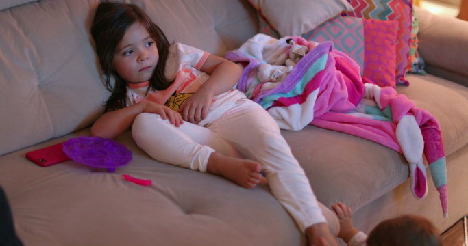Little girl and infant brother baby at home in front of screen. Casual candid authentic children on home sofa.