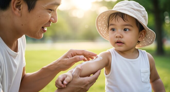 Father applying sunscreen to daughter's face on sunny beach, promoting skin protection and family fun