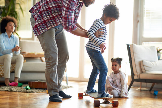 Radiant child playing with a toy car as his father pushes him, in a warm and homely environment.
