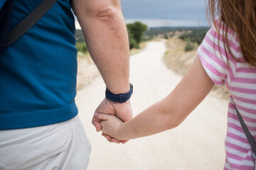 holding hands  father and daugther in path in field. back view.  2024CFCFamilia. outdoor playtime at the park