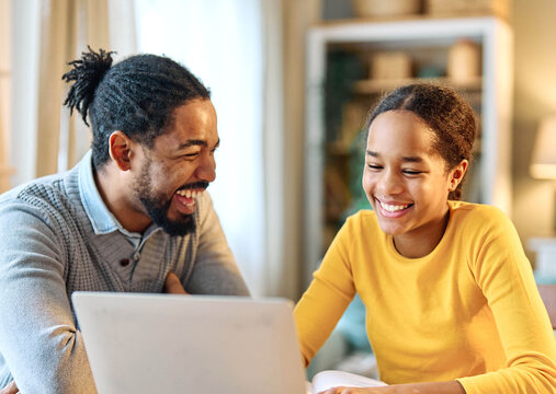 Father and daughter doing homework with laptop at home. Father and teenage girl happy using laptop. Teen girl and dad sitting at home working with notebook