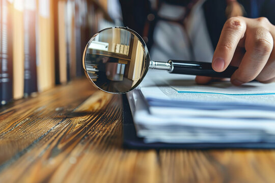 Auditor inspecting company records, pointing at discrepancies, reports and files neatly organized