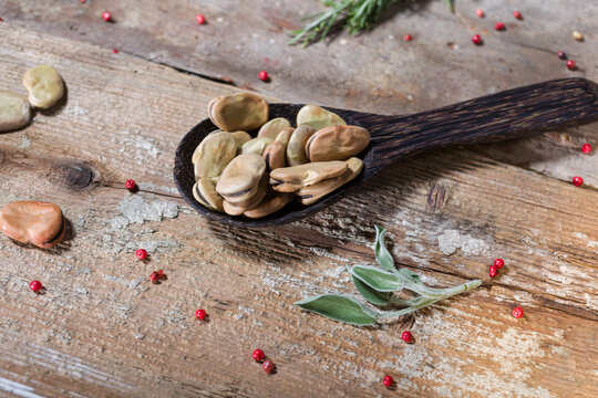 Top-down view of clean flat lay with olive wood spoon and rows of raw lentils, chickpeas, and fava beans