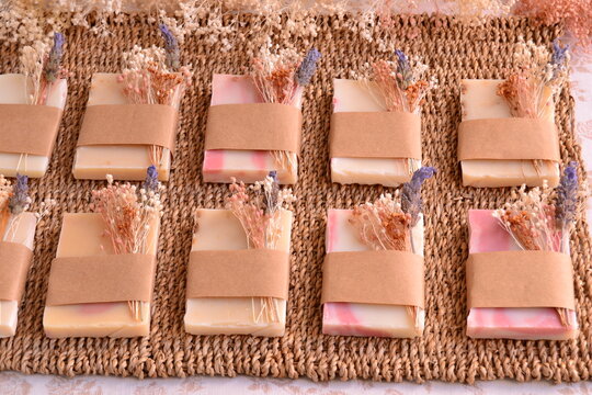 Wedding favors handmade soap guest-gift with dry flowers rustic decoration, diy party souvenir, rustic style, ecological concept