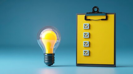 A 3D rendered graphic featuring a glowing lightbulb beside a yellow clipboard with checkboxes on a blue backdrop, suggesting planning