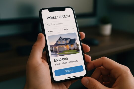 Person browsing home listings on a smartphone app, exploring real estate options and property details. Concept of digital search, housing market, and online listings.