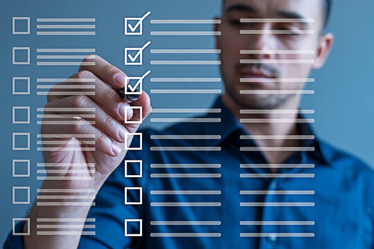 Man completing a digital checklist with a stylus marking off tasks on a virtual todo list for productivity and organization in a modern business or personal management context