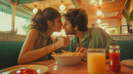 Brazilian couple in a diner, where the woman tenderly feeds her partner a french fry