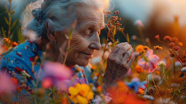Elderly woman surrounded by vibrant wildflowers, feeling relaxed and happy