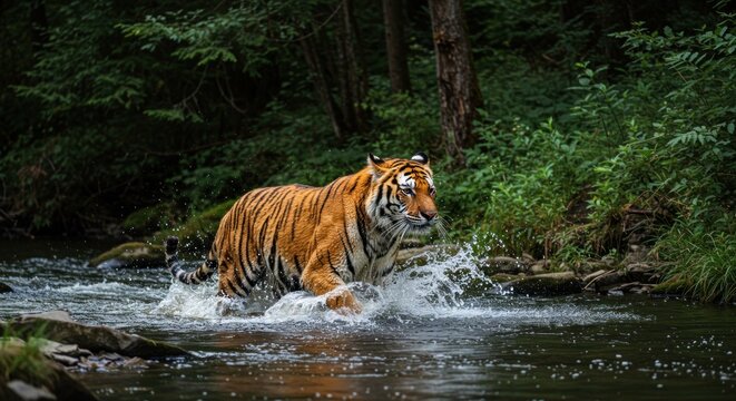 A majestic, orange and black striped feline strides purposefully through a shallow, clear river surrounded by lush, verdant foliage