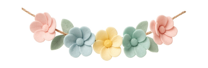 Handmade felt flower garland with pastel colors, suitable for a nursery.