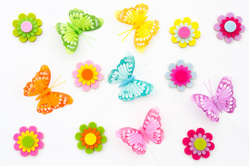 Art and craft, homemade flowers and butterflies on an isolated white background. Creative hobbies.