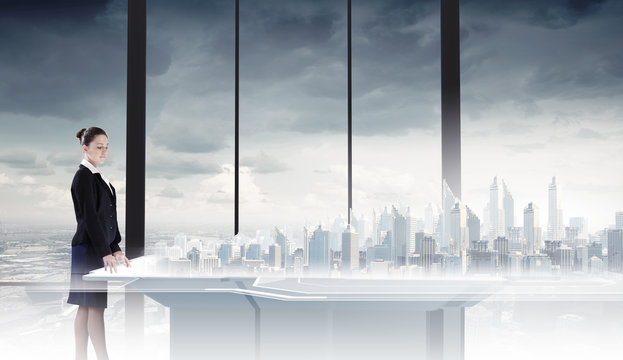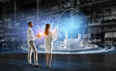 Woman interacting with holographic city model on smart table. Future urban planning technology. Digital twin concept for smart city development and management