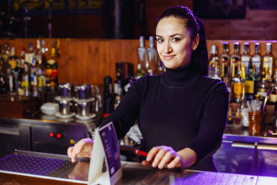 Young female worker at bartender desk in restaurant bar preparing cocktails with shaker. Beautiful young woman behind bar
