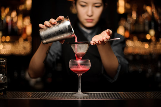 Professional bartender girl pouring a smooth crimson cocktail through the sieve to the glass