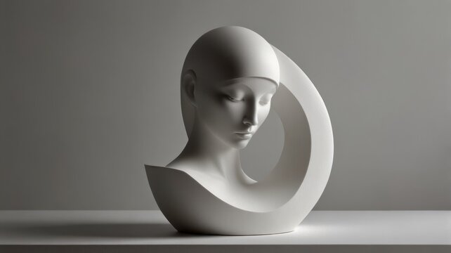Serene female bust sculpture, minimalist design, smooth curves, white plaster, art deco style.