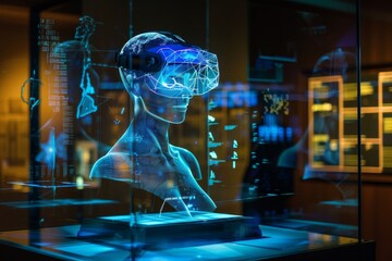 Conceptual Portrait of a Focused Businesswoman Interacting with a Transparent Holographic Digital Screen Interface in a Modern High-Tech Office Environment