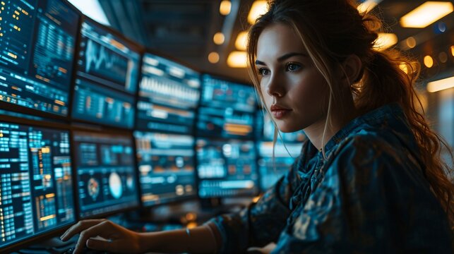 The image shows a woman working on a desktop computer, analysing data, and creating artificial intelligence software in a monitoring room surrounded by big screens.