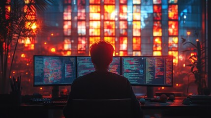 Female Programmer Coding on Multiple Monitors in Modern Office with Stained Glass Decor and Warm Ambience