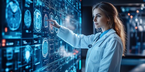 Young female doctor interacts with ai diagnosis interface futuristic healthcare technology innovation