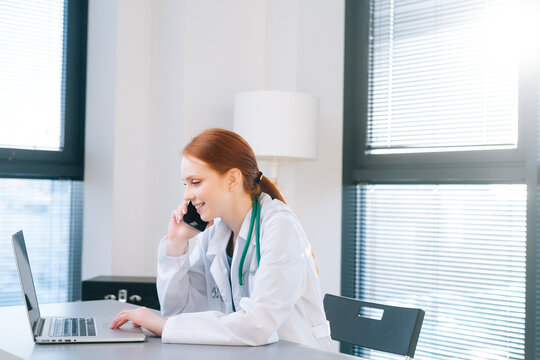 worried female doctor in white coat talking on mobile phone with patient and searching info using laptop during remote distant consultation sitting at desk in medic clinic near window