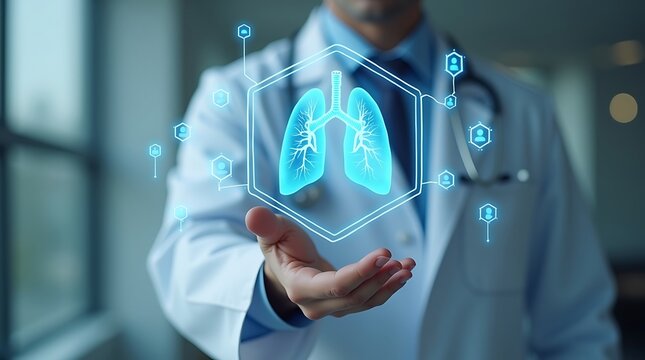 Doctor pressing futuristic medical touchscreen buttons in a high-tech digital interface