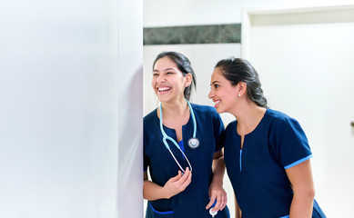 Medical, doctors and healthcare professionals working together on a digital tablet in a hospital. Portrait of a mature female and male doctor smiling and discussing diagnosis in a clinic.