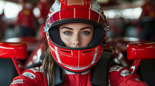 female Formula 1 driver exudes focus and confidence in this dynamic shot. With her helmet and racing suit, she symbolizes strength, determination, and the beauty of women excelling in male-dominated s