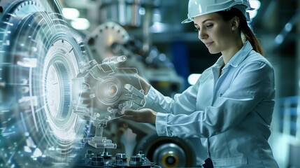 Female industrial engineer is working in a factory setting, using augmented reality technology to interact with a digital twin of a machine part