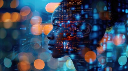 A black woman in profile with computer code and data visualizations overlaying her face, overlaying digital elements