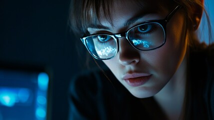 Young caucasian female hacker in glasses focused on computer screen in dark room