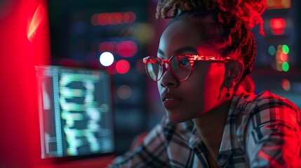 Black Female Cybersecurity Analyst Analyzing AI Cyber Threats on Computer in Dark Tech Office with Blue Lighting