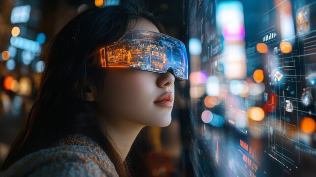 Female It Engineer Analyzing Futuristic Data Visualization Images