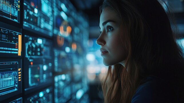 woman in futuristic data center works on glowing screen filled with data and code, tech professional or hacker in a cyberpunk, neon-lit world