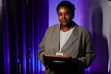 Waist up portrait of female network engineer holding tablet in server room and looking at camera